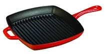 Cast from molten iron in individual sand molds and coated with porcelain enamel this 10 inch square grill pan is perfect for grilling your favorite meats and sandwiches. The ribs insure that food does not sit in grease so it's low fat cooking too. Use to sear grill prepare panini sandwiches. The Lodge Color Square Panini Press is the ultimate companion to this ribbed Grill Pan. Cast iron has superior heat retention so it reduces the amount of energy needed for cooking. The Lodge Color Porcelain Enamel showcases vivid color and with ease of cleaning and resistance to abrasion. It's also stain resistant. The Cooking surface is matte black enamel. Island Spice Red color.