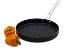 Heavy-gauge hard anodized aluminum pan has a raised grooved cooking surface so the fats and oils simply drain away from your burgers poultry and fish as they cook. And for easy clean up the interior's cooking surface is treated with a nonstick material. The multi-riveted Cool Touch arch-vent handle pulls the heat through and away from the pan keeping it cool so long as it's on the stovetop. Note: Not intended for induction ceramic and glass cooktop surfaces. Because of the pan's raised grooved cooking surface the bottom portion is not entirely flat and will not lie flush against your stovetop surface preventing the heat from penetrating all of your food.